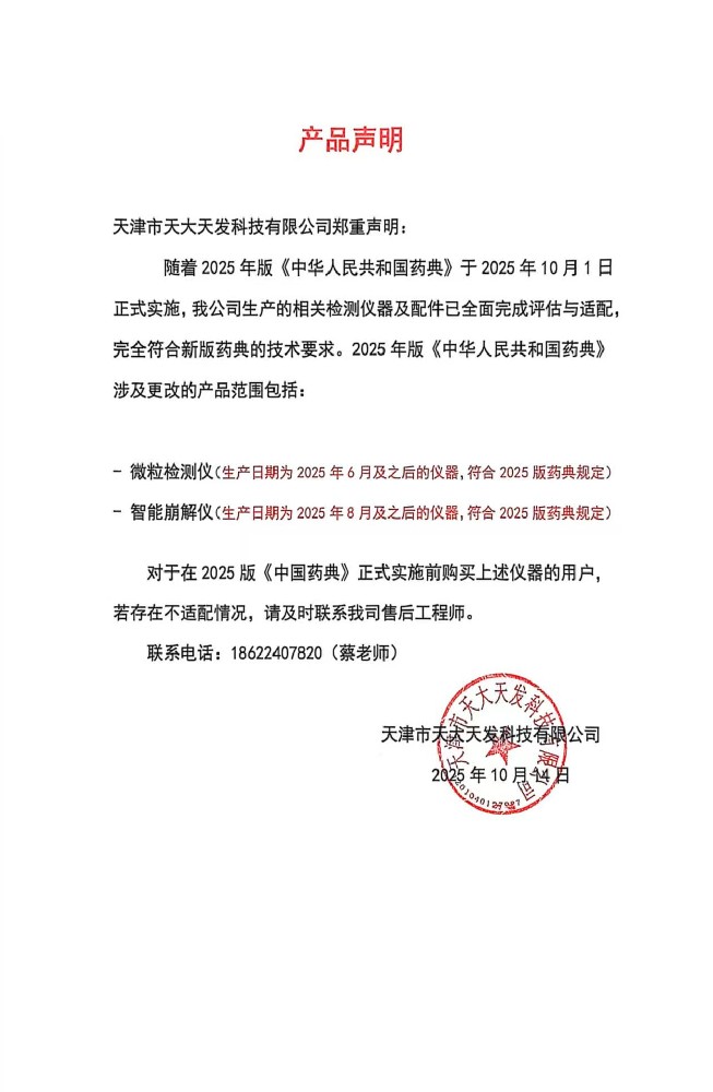 聲 明鑒于2025版《中國藥典》的更新,為保障天大天發(fā)忠實(shí)用戶的切身利益,凡在2025年之前購置我公司設(shè)備的客戶,若您的設(shè)備未能滿足新版藥典的要求,我們將提供升級(jí)服務(wù)。涉及產(chǎn)品:微粒檢測(cè)儀:GWJ-1···...